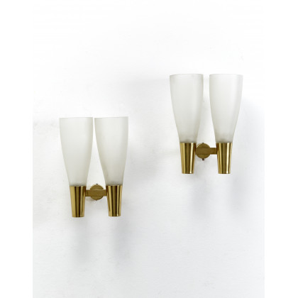 Pair of two-light wall lamps model "1537". Produced by Fontana Arte, Milan, 1957. Brass and etched glass on the external surface. (h 29 cm.) (slight defects)