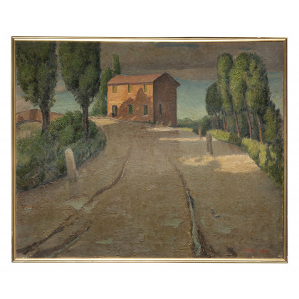 "L'osteria rosa dopo il temporale" olio su compensato (cm 80x100) Firmato in basso a destra Al retro: titolato e firmato In cornice (difetti)