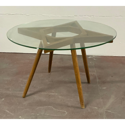Tavolino da salotto con struttura in legno massello e impiallacciato, piano in cristallo. Italia, anni '40/'50. (h cm 53; d cm 89,5) (difetti e restauri)