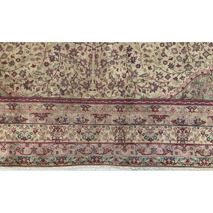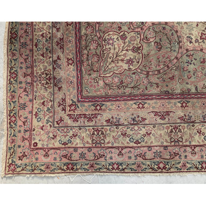 Tappeto Sparta, Anatolia, secolo XX. Decoro con grande medaglione verde chiaro, rosa e beige con puntali su fondo bianco cosparso di rami fioriti (cm 355x455) (difetti)