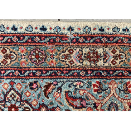 Tappeto Keshan, Persia, secolo XX. Decoro con medaglione stellato su campo bianco ornato da motivo Herati. Recante ad una testata un cartiglio circolare con iscrizione in persiano (cm 249x197) (lievi difetti)