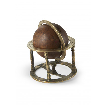 MUHAMMAD ASHRAF Small oak wood celestial globe with brass base with four columns. Islamic art, late 18th - early 19th century (h. cm 11; d. cm 10) (defects)