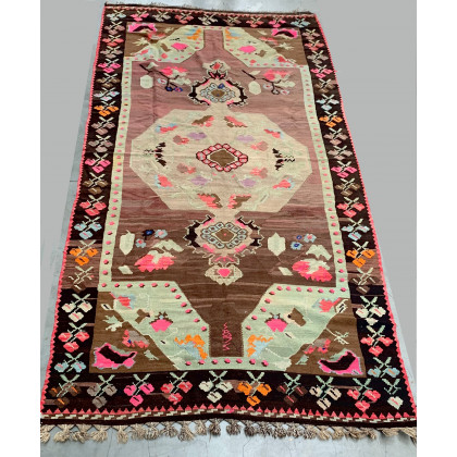 Tappeto Kilim Karabagh, Caucaso, secolo XX. Iscrizione in lettere cirilliche. Decoro con medaglione bianco con puntali su campo color tabacco. Angolari color verde acquamarina (cm 376x170) (difetti)