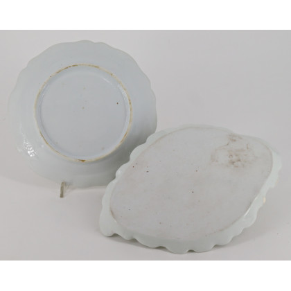 Manifattura di Ginori, Doccia, secolo XVIII. Lotto composto da un calamaio in porcellana bianca con putto e portacandela a vaso e un piattino polilobato con decoro a festoni in rilievo (L cm 25, d. cm 20,5) (difetti e restauri al calamaio)