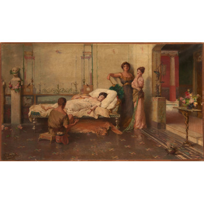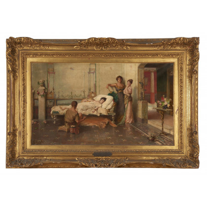 "Scena pompeiana" olio su tela (cm 43x71,5) firmato in basso a sinistra al retro: cartigli in cornice (difetti) Provenienza Collezione Enrico Alllievi