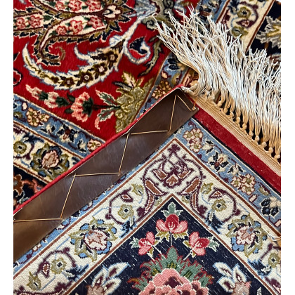 Tappeto preghiara Tabriz, Persia, secolo XX. Decoro con piccolo medaglione a fondo blu con puntali e lampada votiva su campo rosso decorato con Boteh, volatili e rami fioriti, alla base una mensola che regge un vaso fiorito. Bordura Herati policroma su fondo blu notte (cm 236x155) (difetti)