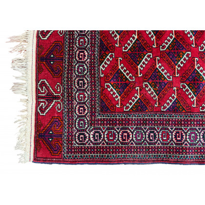 Tappeto Yomut, Turkestan occidentale, secolo XX. Decoro con Memling Gul su fondo rosso. Bordura con G Gul su fondo bianco. Alle due testate una fascia con motivo Kotchiak (cm 201x133) (difetti)