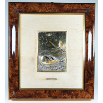 Quadro in lastra di resina rivestita in argento raffigurante tramonto, marcato Ottaviani (cm 23x16) In cornice (cm 48x55) (difetti)