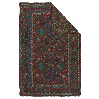 Tappeto Soumak, Caucaso, secolo XX. Decoro con quattro medaglioni romboidali policromi su fondo rosa carico cosparso di altri medaglioni nei toni del verde. Doppia bordura a calici e foglie dentate su fondo azzurro e verde e doppia greca cane che corre (cm 310x209) (difetti)