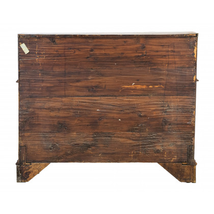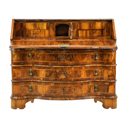 Ribalta lastronata in noce e radica di noce con filettature, fronte mosso a tre cassetti e calatoia che rivela quattro tiretti, antina e vano con piano scorrevole, piedi a mensola. Veneto, secolo XVIII (cm 102x100x58) (difetti e mancanze)