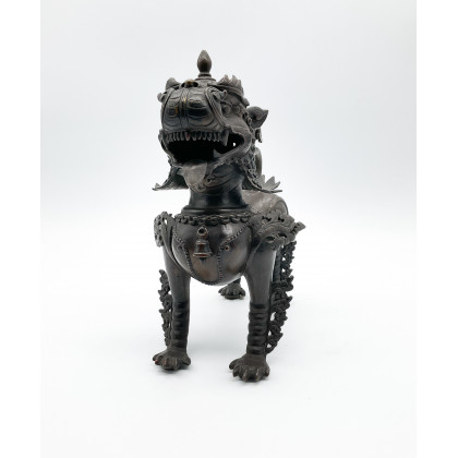 Scultura di leone delle nevi in bronzo inciso e traforato Nepal, secolo XIX (cm 26x30) (difetti) Il leone è raffigurato poggiato su quattro zampe e decorato con gioielli e ornamenti. Fiamme di saggezza si irradiano da spalle, gambe, testa e coda. Ha una criniera folta, elaborata e finemente realizzata, con la bocca spalancata e la lingua sporgente. Questo tipo di elaborata decorazione distingue il leone nepalese dalle versioni indiane e da quelle di altre culture. Il motivo del leone delle nevi giunse in Nepal dal Tibet nel XVI secolo, dove era considerato uno degli animali di buon auspicio raffigurati nell’arte. Nell’arte indiana trovò il suo corrispettivo nel leone indiano, ed entrambi i motivi erano intesi a trasmettere potere e divinità. In questo contesto, il leone delle nevi è spesso utilizzato come elemento di supporto nella raffigurazione dei troni, compresi quelli su cui siedono le immagini del Buddha. Per confronto si veda: Bromberg, A., et al ., Le arti dell'India, del Sud-est asiatico e dell'Himalaya: al Dallas Museum of Art , Yale University Press, 2013. Waldschmidt, E & RL, Nepal: tesori d'arte dall'Himalaya, Elek Books, 1967.