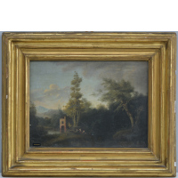 3946Massimo D'Azeglio(Attr.) "Paesaggio boschivo con mulino e massaie" olio su…Estimate € 600 - 700Sold for € 500
