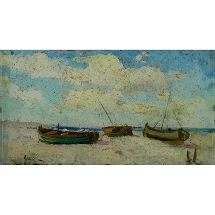 Pietro Antonio Gariazzo (Torino 1879-1963) "Spiaggia" olio su cartone (cm 27x50) al retro etichetta delle Mostre d'arte Caver