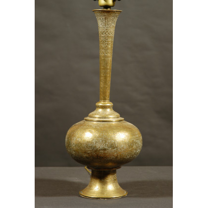 Arte orientale del sec. XIX - Vaso a collo stretto con corpo bombato in ottone fittamente cesellato a volute, motivi folgiacei , geometrici e versetti in arabo. (Montato a luce elettrica in epoca posteiore (h cm 60) (lievi difetti).