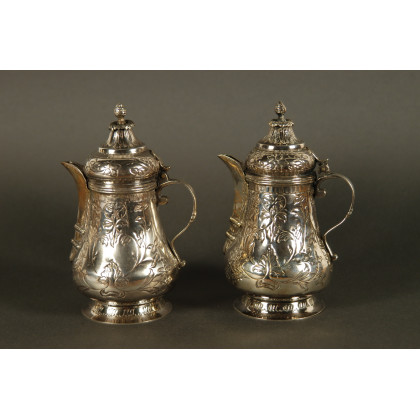 Due caffettiere turche in argento con corpo inciso e volute fogliate. Coperchio a cupola con pomolo e bacca (gr 500 ca)