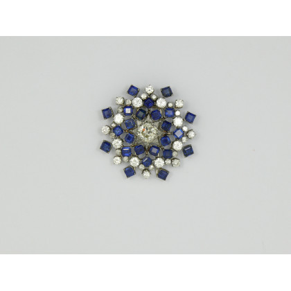 Spilla anni '50 a clip in platino con al centro un diamante taglio Vecchia Miniera di ct 0.90 circa,circondato da zaffiri blu taglio carrÞ di ct 3,00 circa e diamanti taglio brillante e huit huit di ct 2,30 ca. (gr 15,30 ca)