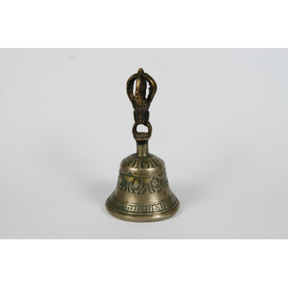 Arte tibetana sec. XIX. Campana rituale ghanta in metalli diversi con decori incisi (h cm 18)