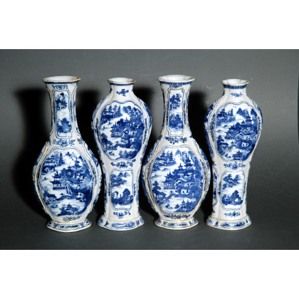 Manifattura di Cina sec. XVIII Set di quattro vasetti in porcellana bianca a decoro monocromo blu con paesaggi architettonici e naturalistici entro riserve sagomate con profili dorati. Corpo perlinato a frutti e fiori sparsi. (h.cm. 29,5) (vecchi restauri).
