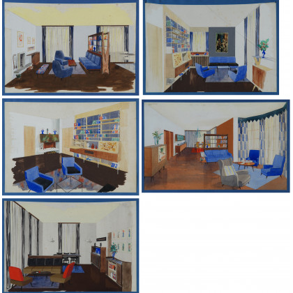 Gruppo di cinque acquarelli raffiguranti studi per interni con complementi di arredo, 1940 ca. Misure diverse. In cornici.