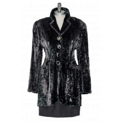 Gianfranco Ferrè: completo giacchina in velluto di seta cangiante nei toni del grigio, gonna in vigogna, bottoni in osso