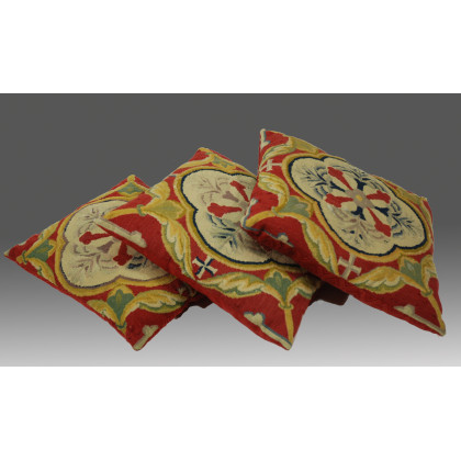 Lotto di tre cuscini a piccolo punto nei toni del rosso avorio e beige con decoro floreale (difetti)