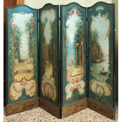 Paravento a quattro ante dipinte ad olio su tela raffiguranti scenette settecentesche entro cornici floreali e vegetali, sec.XIX (cm190x240) (qualche difetto)