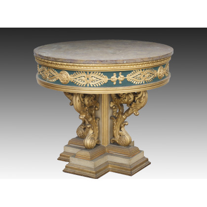 Tavolo da centro "direttorio" di forma tonda in legno intagliato, laccato e dorato. Piano in marmo e fascia intagliata a rosoni e motivi vegetali. Gamba squadrata con montanti intagliati a motivi vegetali a tutto tondo. Seconda metà del sec. XIX (d cm 94x h cm 80)