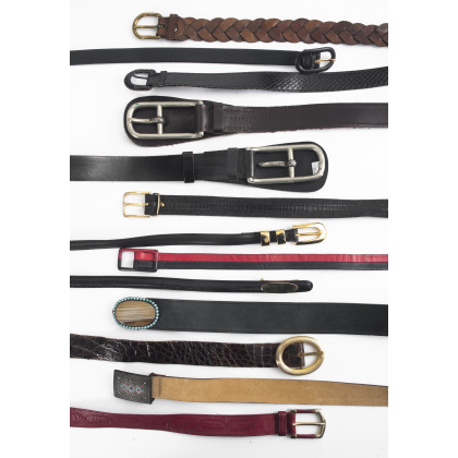 Lotto composto da tredici cinture in pelle con fibbie in metallo e pietre, colori e misure diversi (difetti)