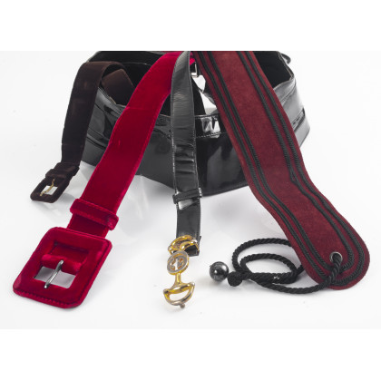 Gucci, Yves Saint Laurent, Chloé e André Laug: lotto composto da cinque cinture in vernice color nero, camoscio color ruggine e velluto in colori diversi (difetti)
