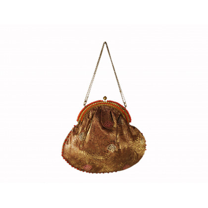Borsettina da sera a sacchetto in tessuto jacquard color oro, chiusura in metallo dorato con applicazioni in perline di corallo, completa di tracolla a catena (difetti)