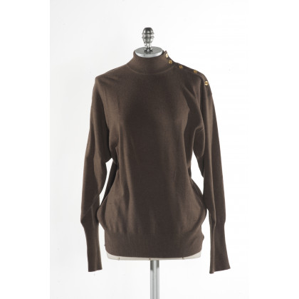 Chanel: golf in cachemire color marrone con abbottonatura sulla spalla in metallo dorato monogrammato (difetti)