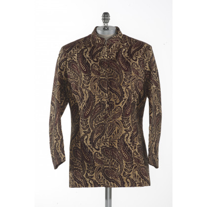Giacca da sera a manica lunga in tessuto jacquard oro e bordeaux, chiusura a sette bottoni ricoperti di tessuto.