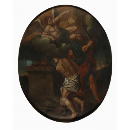 Scuola del sec. XVIII "Il sacrificio di Isacco" olio su tela ovale (cm 118x95) In cornice dell'epoca (difetti)