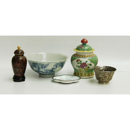 Lotto di cinque oggetti cinesi: ciotola, piccola potiche, piattino smaltato, ciotola argentata e vasetto cloisonnè (difetti)