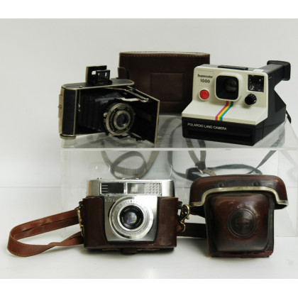 Tre macchine fotografiche: una Zeiss modello Contessa LK, una polaroid ed una a soffietto (difetti)