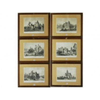 Gruppo di sette litografie raffiguranti i Castelli della Loira, in cornici, Francia, sec. XIX.
