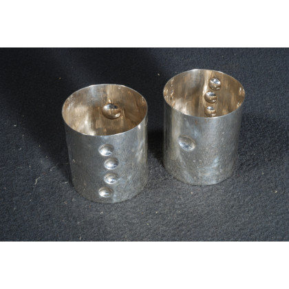 Coppia di vasetti cilindrici a corpo liscio decorati da bolle concave. Titolo 925. Argentiere B. R. Firenze, 1971, (gr. 460).