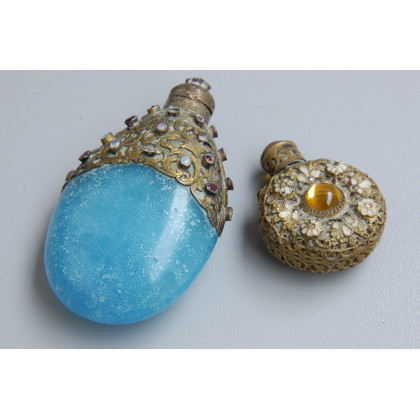 Due boccette portaprofumo con ghiere in metallo e pietre dure.