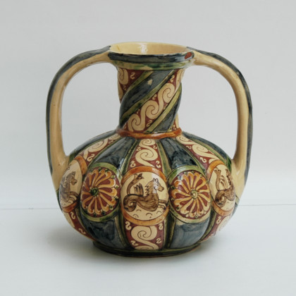 Vaso biansato con corpo lobato in ceramica S.Zeno, Pisa, decorato in policromia con figure fantastiche e fiori stilizzati