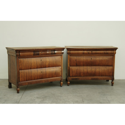 Coppia di comò in noce a tre cassetti con gambe anteriori tornite, sec. XIX (cm 128x95x59)(difetti)