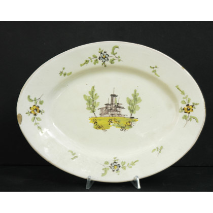 Piatto ovale a bordo liscio in maiolica con decorazione a gran fuoco "a paesini" o anche detta "a castelletto" con fiori sparsi sul bordo. Faenza, fine sec XVIII inizi sec XIX (restauri)