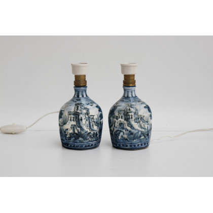 Coppia di piccole lampade in ceramica di Albissola bianca e blu (difetti)