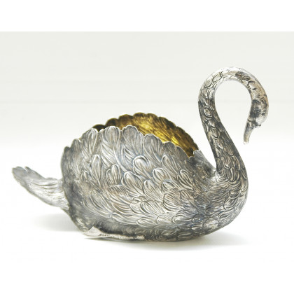Cigno in argento porta bon bon, finemente cesellato, marchio austriaco XIX sec ( h cm 15,5; gr 470)