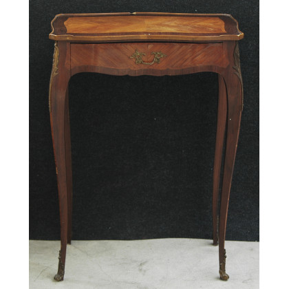 Tavolino lastronato in legni pregiati, gambe mosse, un tiretto alla fascia, piano sagomato, applicazioni, in metallo dorato, inizi sec XX