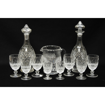 Servizio composto da numerosi bicchieri diversi, due bottiglie ed una brocca in cristallo molato
