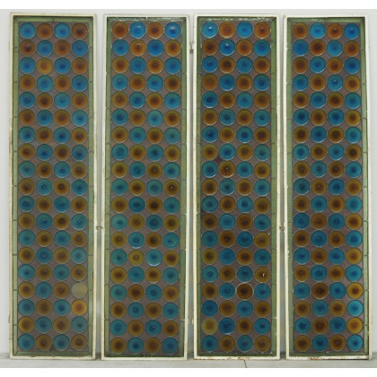 Quattro pannelli in vetri policromi legati a piombo, motivo a fondo di bottiglia (cm 190x45) (difetti)