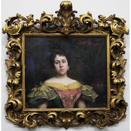 "Ritratto di gentildonna" pastello su carta (cm 70x80)Firmato in alto a destra in bella cornice in legno intagliato e traforato a motivi vegetali e volute