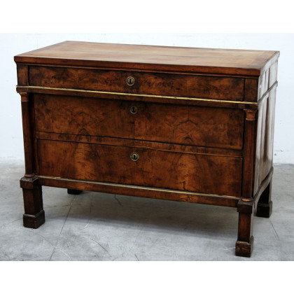 Comò impero in noce a un cassetto sottopiano e due grandi sul fronte, montanti decorati a colonne tornite, piedi a pilastro. Sec XIX (cm 118x87x60)