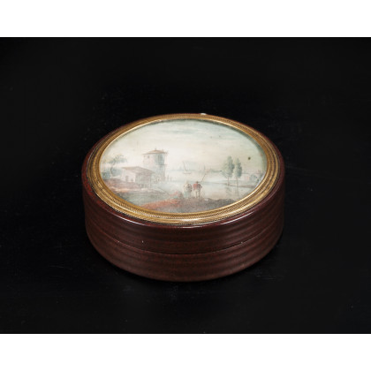 Tabacchiera in legno e tartaruga, il coperchio con miniatura raffigurante pescatori in paesaggio lacustre (d cm 7,4). Sec XIX