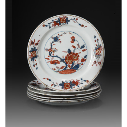 Sei piatti piani in maiolica policroma con decorazione di gusto orientale alla peonia nei colori blu a gran fuoco, rosso ferroso dal tono arancio e oro a piccolo fuoco per il bordo e i rialzi e smalto leggermente azzurrato (diam cm 22,5) (usure, restauri e rotture) Milano, manifattura di Pasquale Rubati, 1770 circa Six polychrome maiolica plates decorated with oriental style peonies. (losses, restorations) Milano, Pasquale Rubati circa 1770